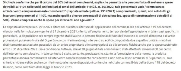 Membro03/03/2022 alle 12:05 in risposta a: Scadenza 30 Giugno 2022 unifamiliariCiao Pietro il 30% si riferisce all’importo complessivo, quindi comprendente anche i lavori non superbonus 110. L’Agenzia delle Entrate lo ha chiarita in una FAQ che ti allego. Al momento non è chiarito come asseverare questo SAL, ma probabilmente il tecnico lo farà in autocertificazione con un proprio modulo da conservare in archivio (chissà se l’Agenzia delle Entrate non pubblichi un ulteriore chiarimento).